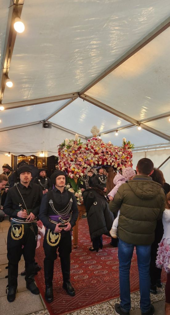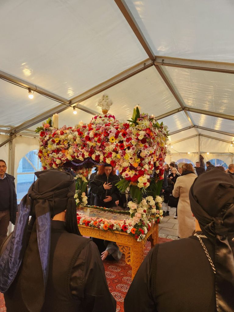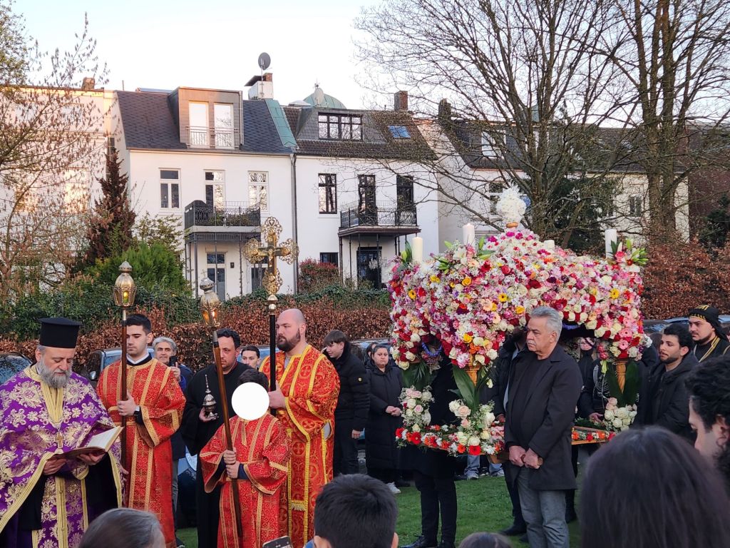Über 2000 Gläubige fanden sich zur Karfreitagsfeier ein Ereignis mit besonderer Liturgie und Ritualen dar. Vor dem Altar steht an diesem Tag zunächst das Kreuz Jesu, aber ohne Jesusfigur, die bereits am Vorabend abgenommen wird. In Liedern und Psalmen wird die Leidensgeschichte von Jesu und der Kreuzigung erzählt. Der Höhepunkt der Feierlichkeit dreht sich jedoch um die symbolische Totenbahre, die das Grab Jesu symbolisiert und auf Griechisch Epitaphios (ἐπιτάφιος) genannt wird. Die Gläubigen gehen unter dem Grabtisch hindurch, nicht ohne zuvor die Ikone darauf geküsst zu haben. Am Abend kommt dann der Priester zum Epitaphios und führt die Prozession in Gedenken an die Leiden Jesu an.